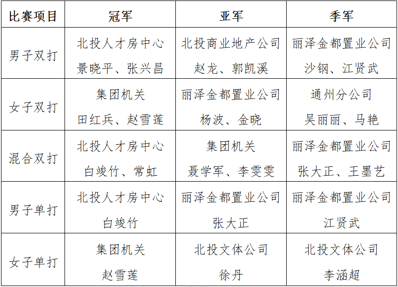北投人才房中心景曉平、張興昌,北投商業(yè)地產公司趙龍、郭凱溪,麗澤金都置業(yè)公司沙鋼、江賢武鏖戰(zhàn)群雄,分別獲得男子雙打前三名;集團機關田紅兵、趙雪蓮,麗澤金都置業(yè)公司楊波、金曉,通州分公司吳麗麗、馬艷也毫不示弱一路過關斬將,取得女子雙打一、二、三等獎;在混合雙打比賽中,北投人才房中心白竣竹、常虹,集團機關聶學軍、李雯雯,麗澤金都置業(yè)公司張大正、王墨藝靚出風格,賽出氣勢,分別奪得前三名;在男單、女單的比賽中,各參賽選手紛紛拿出看家本領,使出渾身解數(shù),展現(xiàn)個人實力與魅力,男單前三名分別是北投人才房中心白竣竹,麗澤金都置業(yè)公司張大正、江賢武,女單前三名分別是集團機關趙雪蓮,北投文體公司徐丹、李涵超。本次比賽還設置了團體獎,根據(jù)各參賽隊的比賽積分,北投人才房中心獲得團體冠軍、麗澤金都置業(yè)公司獲得團體亞軍、集團機關獲得團體季軍。